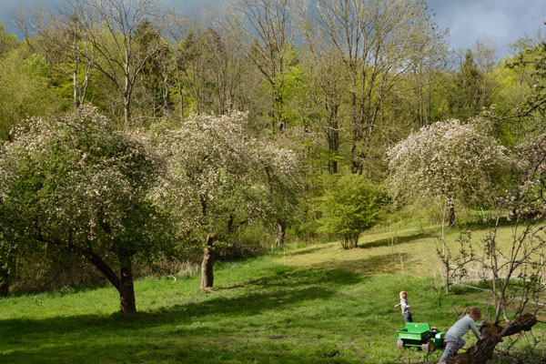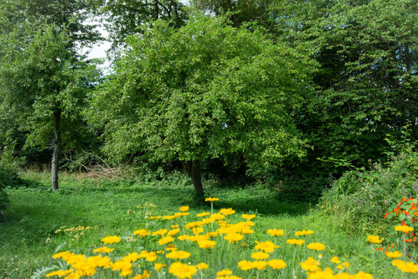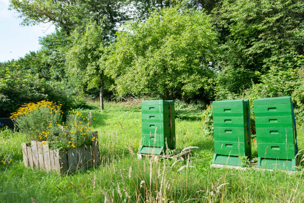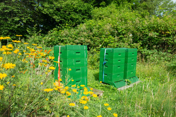 Meine Bienen leben in einem Naturschutzgebiet zwischen Wäldern, Seen und Meer auf einer naturbelassenen Streuobstwiese.